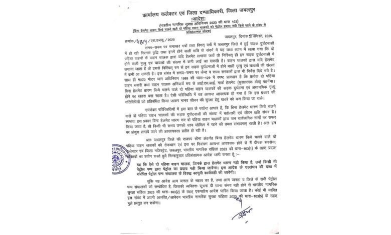 जबलपुर। इंदौर और भोपाल की तर्ज पर अब जबलपुर में भी बिना हेलमेट पहने दोपहिया वाहन चालकों को पेट्रोल नहीं मिलेगा। जिला कलेक्टर एवं जिला दंडाधिकारी दीपक सक्सेना ने भारतीय नागरिक सुरक्षा अधिनियम 2023 की धारा 163 के तहत यह आदेश जारी किया है। आदेश के अनुसार जिले की सीमा में किसी भी पेट्रोल पंप पर बिना हेलमेट पहने चालकों को पेट्रोल या ईंधन प्रदान करना प्रतिबंधित रहेगा। इस नियम का उल्लंघन करने पर संबंधित पेट्रोल पंप संचालकों के खिलाफ कानूनी कार्रवाई की जाएगी। यह आदेश 5 अगस्त से ही प्रभावी माना जाएगा।