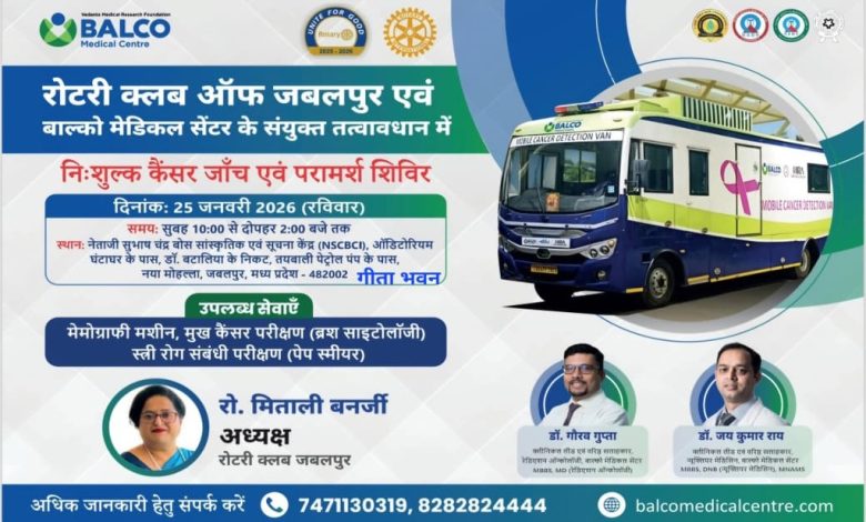 जबलपुर। रोटरी क्लब जबलपुर एवं बालको मेडिकल सेंटर, रायपुर (छत्तीसगढ़) के संयुक्त तत्वावधान में रविवार, 25 जनवरी को गीता भवन कन्वेंशन सेंटर, घंटाघर के पास, जबलपुर में एक निःशुल्क कैंसर जांच शिविर का आयोजन किया जा रहा है।