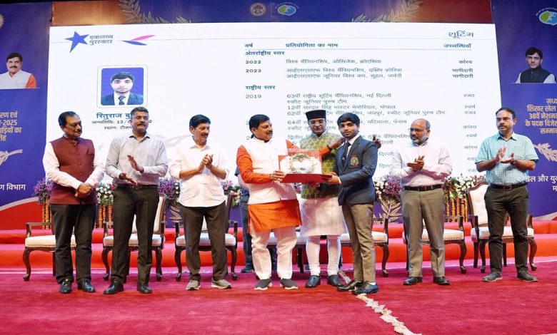 भोपाल। राजधानी के रवींद्र भवन में आयोजित भव्य समारोह में मुख्यमंत्री डॉ. मोहन यादव ने वर्ष 2023 के लिए शिखर खेल अलंकरण प्रदान किए। इस अवसर पर उत्तराखंड में आयोजित 38वें राष्ट्रीय खेलों में पदक हासिल करने वाले प्रदेश के 121 खिलाड़ियों को भी सम्मानित किया गया।